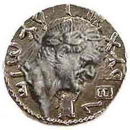 Auf der Rückseite erkennt man noch gut einen Teil der auf dem Kopf stehenden griechischen Inschrift; in lateinischen Lettern gibt dies:[BASI]LEOS ANTIG[ONOS]. Wikimedia commons