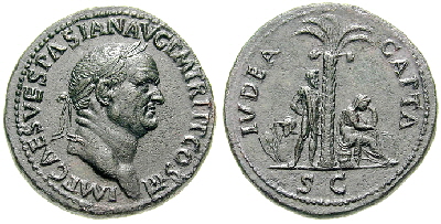 Die Niederschlagung des Aufstandes 70 n.Chr. durch Titus im Auftrag Kaiser Vespasians (reg.69-79) ist in verschiedenen römischen Münzen mit dem Motiv “Iudaea capta” dokumentiert (siehe bei der AJHS).